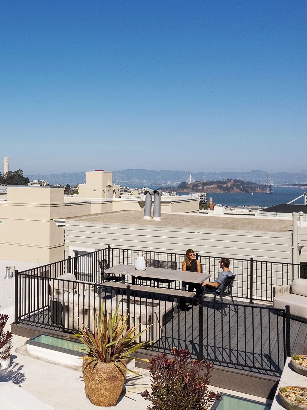 A new central stair connects the basement level with the two-story home above and continues upwards to a large, new, sun-drenched roof deck with beautiful views of the city and the bay. The owners say they enjoy spending much of their time on the roof and that it has quickly become their favorite “room” in the house.